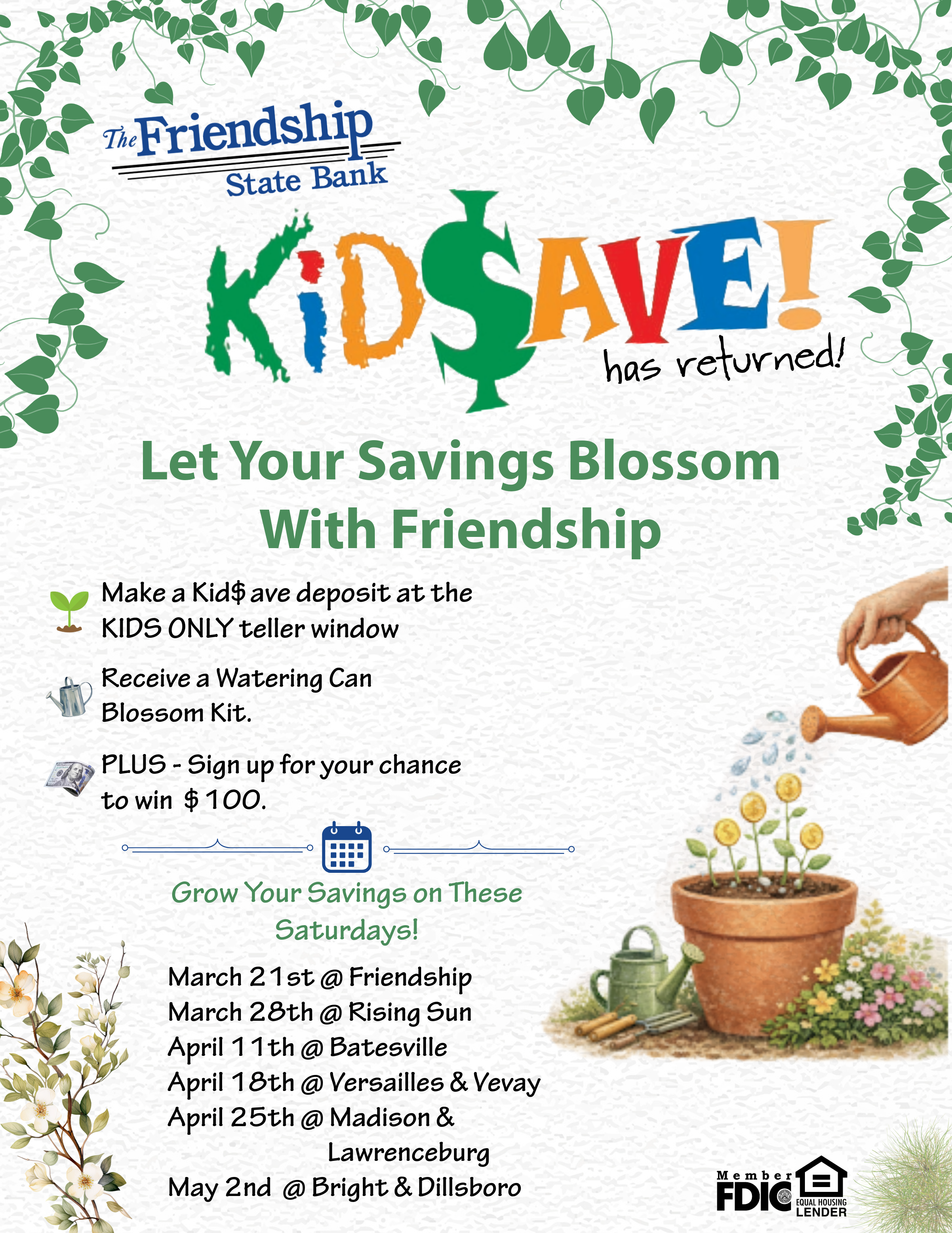 Make a Kid$ave! deposit at your Kids-Only teller window and receive a Watering Can Blossom Kit! PLUS.... sign up for your chance to win $100!